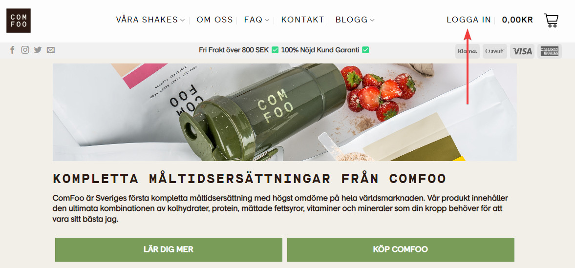Steg 1. Klicka på “Mitt konto” bredvid varukorgen i toppen, på botten av hemsidan eller här under.